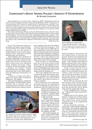 A Story Worth Making a Movie of Published 05 Oct 2010 Share Published in the United States by the Institute of Electrical and Electronics Engineers, the IEEE Communications Magazine presents an extensive biography of Professor Janusz Filipiak in its October issue.